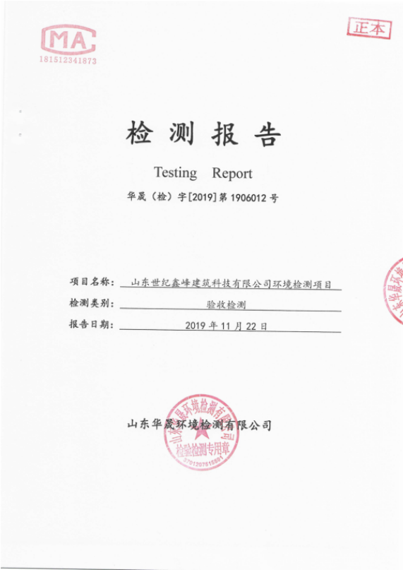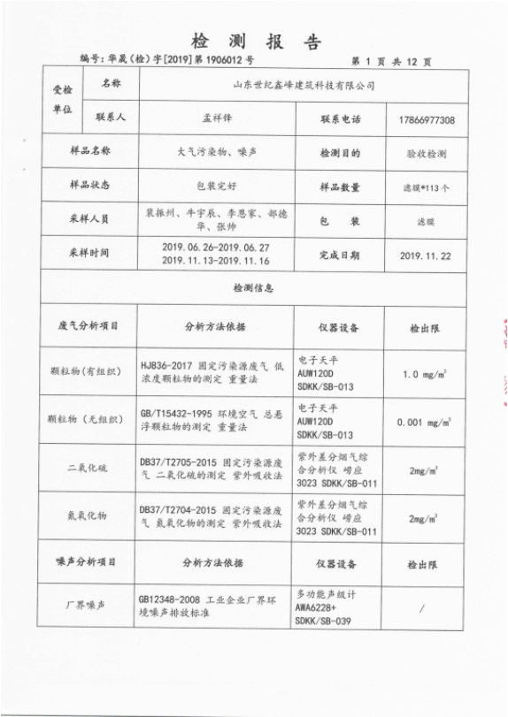 項目名稱: 山東世紀鑫峰建筑科技有限公司環(huán)境檢測項目